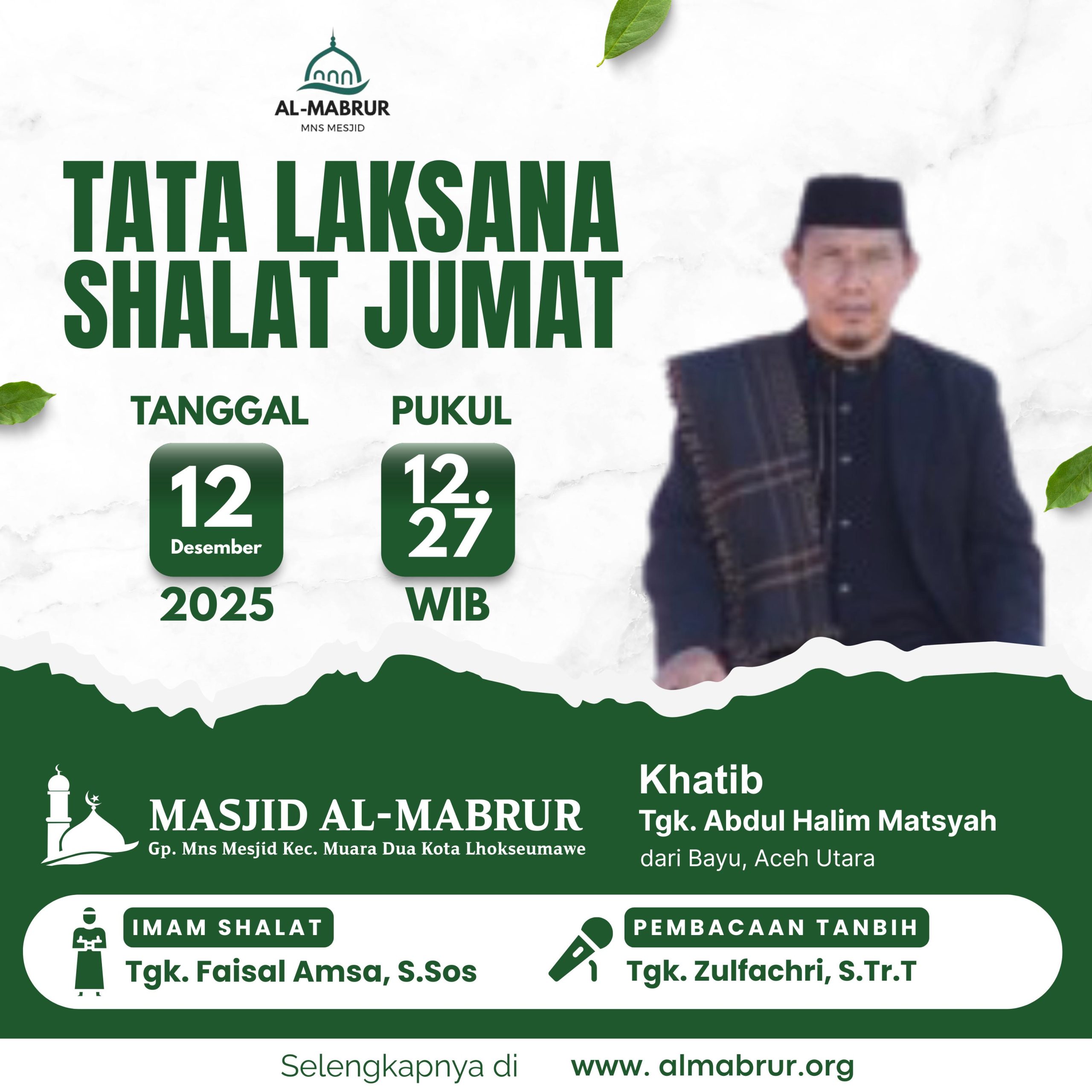 BKM Masjid Al-Mabrur Gampong Meunasah Mesjid Kecamatan Muara Dua Kota Lhokseumawe dengan ini menginformasikan Tata Laksana Shalat Jum’at sebagai berikut :